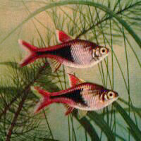 Rasboras, or harlequin fishes. They like a slightly acidic pH (6.5-7.0), a dark bottom, real plants and bubbles to play in all day. They live wild in warm Asian climates like Vietnam.